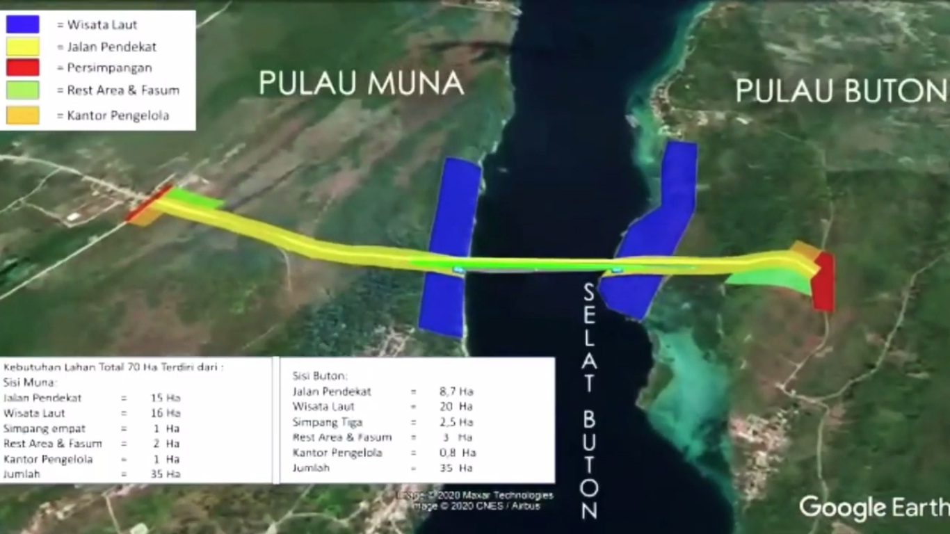 “Kurang lebih ada 70 hektar lahan yang diperlukan. Jadi baik Kota Baubau maupun Buton Tengah, masing-masing itu 35 hektar lahan yang harus mereka bebaskan. Nanti ada juga beberapa fasilitas umum yang kita bangun disekitar jembatan, seperti rest area, pembangunan lokasi wisata baru dan lain sebagainya. Karena besar harapan kami, dengan hadirnya jembatan Tona ini, bisa mendorong peningkatan ekonomi masyarkaat,” kata Ali Mazi.
